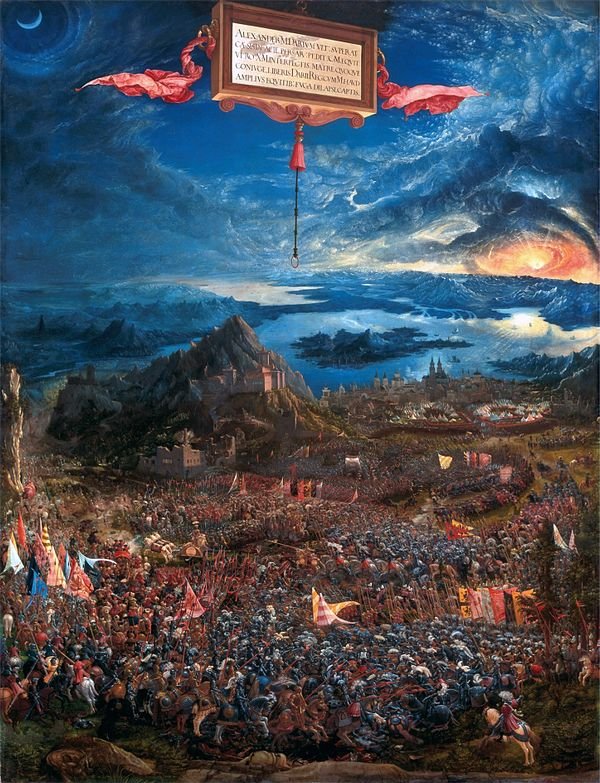 The armies’ banners in the painting, for example, display each side’s total strength and future casualties. On the other hand, the upper half of the painting—resplendent with the Sun, Moon, and even a Tower of Babel in the shadows—bears far more primordial connotations. But, most importantly, in spite of Altdorfer’s meticulous attention to historical detail vis-à-vis the statistics of the war, the soldiers in Alexanderschlacht look nothing like either Persians or Macedonians. Instead, Alexander’s men look like Europeans, and Darius III’s like the Ottomans that attempted to siege Vienna in 1529—the same year that Altdorfer finished the painting.